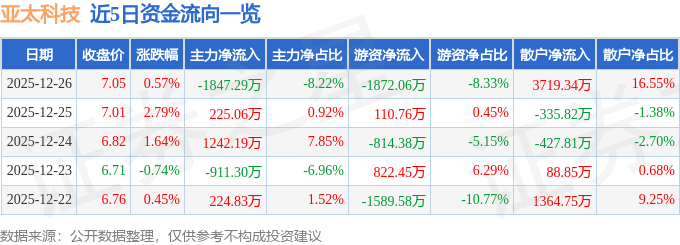 证券之星消息,截至2025年12月26日收盘,亚太科技(002540)报收于7.05元,上涨0.57%,换手率3.66%,成交量31.86万手,成交额2.25亿元。