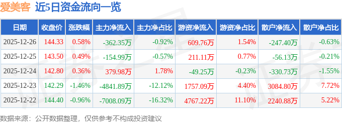 证券之星消息,截至2025年12月26日收盘,爱美客(300896)报收于144.33元,上涨0.58%,换手率1.31%,成交量2.74万手,成交额3.95亿元。