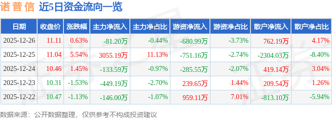 证券之星消息,截至2025年12月26日收盘,诺 普 信(002215)报收于11.11元,上涨0.63%,换手率2.08%,成交量16.36万手,成交额1.83亿元。