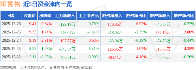 证券之星消息,截至2025年12月26日收盘,深 赛 格(000058)报收于9.41元,上涨0.64%,换手率2.01%,成交量19.76万手,成交额1.86亿元。