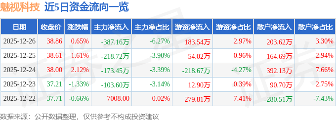 证券之星消息,截至2025年12月26日收盘,魅视科技(001229)报收于38.86元,上涨0.65%,换手率3.01%,成交量1.59万手,成交额6178.83万元。