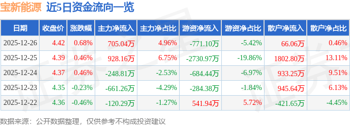 证券之星消息,截至2025年12月26日收盘,宝新能源(000690)报收于4.42元,上涨0.68%,换手率1.48%,成交量32.23万手,成交额1.42亿元。