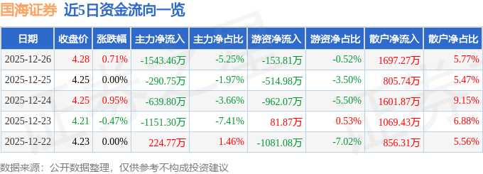 证券之星消息,截至2025年12月26日收盘,国海证券(000750)报收于4.28元,上涨0.71%,换手率1.19%,成交量68.7万手,成交额2.94亿元。