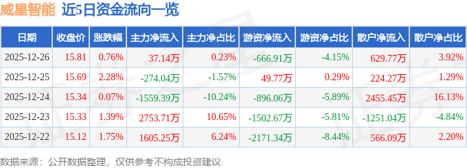 证券之星消息,截至2025年12月26日收盘,威星智能(002849)报收于15.81元,上涨0.76%,换手率5.27%,成交量10.21万手,成交额1.61亿元。