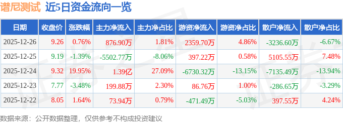证券之星消息,截至2025年12月26日收盘,谱尼测试(300887)报收于9.26元,上涨0.76%,换手率14.42%,成交量52.24万手,成交额4.85亿元。