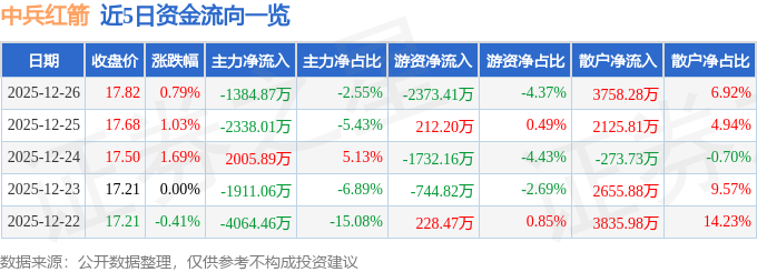 证券之星消息,截至2025年12月26日收盘,中兵红箭(000519)报收于17.82元,上涨0.79%,换手率2.19%,成交量30.45万手,成交额5.43亿元。