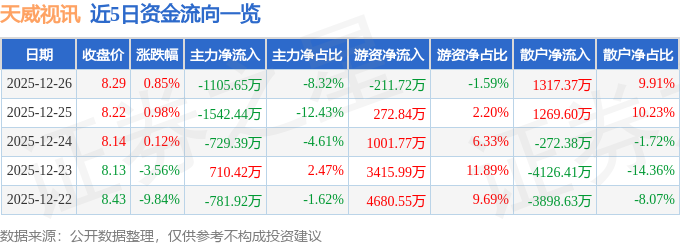 证券之星消息,截至2025年12月26日收盘,天威视讯(002238)报收于8.29元,上涨0.85%,换手率2.0%,成交量16.03万手,成交额1.33亿元。