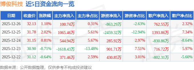 证券之星消息,截至2025年12月26日收盘,博俊科技(300926)报收于32.13元,上涨1.1%,换手率3.39%,成交量10.09万手,成交额3.28亿元。