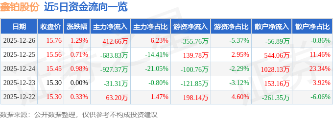 证券之星消息,截至2025年12月26日收盘,鑫铂股份(003038)报收于15.76元,上涨1.29%,换手率2.54%,成交量4.21万手,成交额6626.27万元。