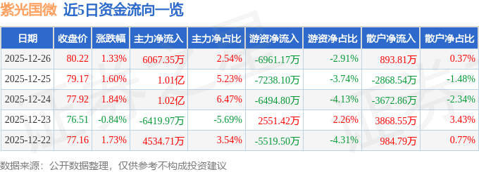 证券之星消息,截至2025年12月26日收盘,紫光国微(002049)报收于80.22元,上涨1.33%,换手率3.49%,成交量29.65万手,成交额23.89亿元。