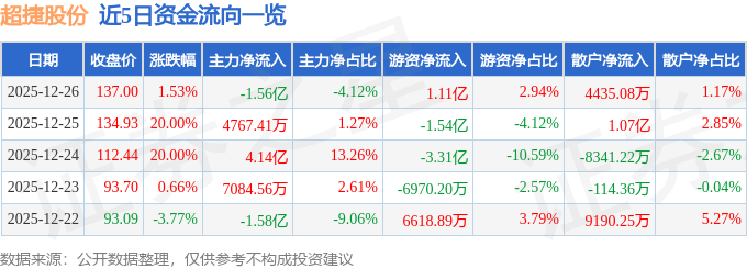 证券之星消息,截至2025年12月26日收盘,超捷股份(301005)报收于137.0元,上涨1.53%,换手率20.89%,成交量27.65万手,成交额37.82亿元。