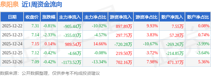 资金流向数据方面,本周泉阳泉主力资金合计净流出1449.11万元,游资资金合计净流入1397.02万元,散户资金合计净流入52.09万元。本周资金流向一览见下表: