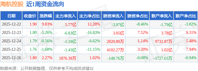 资金流向数据方面,本周海航控股主力资金合计净流出3.48亿元,游资资金合计净流出3259.9万元,散户资金合计净流入3.8亿元。本周资金流向一览见下表: