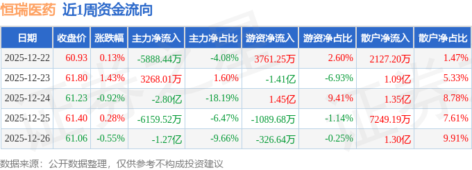 资金流向数据方面,本周恒瑞医药主力资金合计净流出4.94亿元,游资资金合计净流入2718.0万元,散户资金合计净流入4.67亿元。本周资金流向一览见下表: