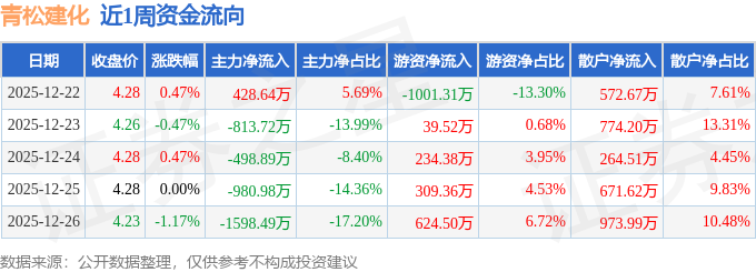 资金流向数据方面,本周青松建化主力资金合计净流出3463.44万元,游资资金合计净流入206.45万元,散户资金合计净流入3256.99万元。本周资金流向一览见下表: