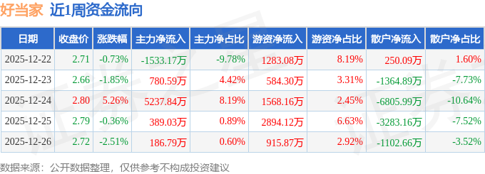 资金流向数据方面,本周好当家主力资金合计净流入5061.09万元,游资资金合计净流入7245.53万元,散户资金合计净流出1.23亿元。本周资金流向一览见下表: