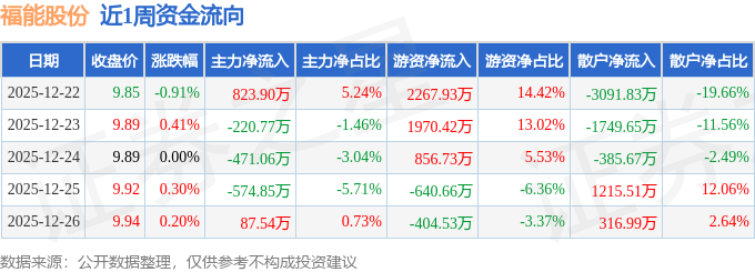 资金流向数据方面,本周福能股份主力资金合计净流出355.24万元,游资资金合计净流入4049.89万元,散户资金合计净流出3694.65万元。本周资金流向一览见下表: