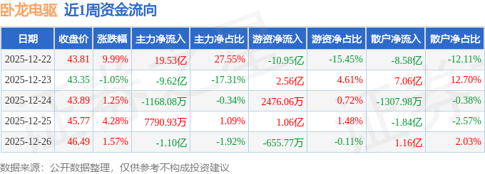 资金流向数据方面,本周卧龙电驱主力资金合计净流入9.47亿元,游资资金合计净流出7.14亿元,散户资金合计净流出2.33亿元。本周资金流向一览见下表: