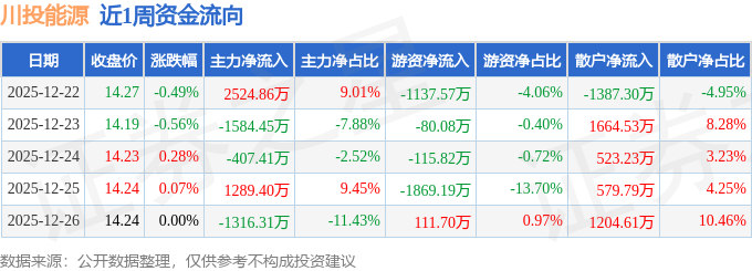 资金流向数据方面,本周川投能源主力资金合计净流入506.09万元,游资资金合计净流出3090.95万元,散户资金合计净流入2584.86万元。本周资金流向一览见下表: