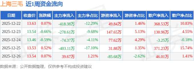 资金流向数据方面,本周上海三毛主力资金合计净流出1134.8万元,游资资金合计净流入221.31万元,散户资金合计净流入913.49万元。本周资金流向一览见下表: