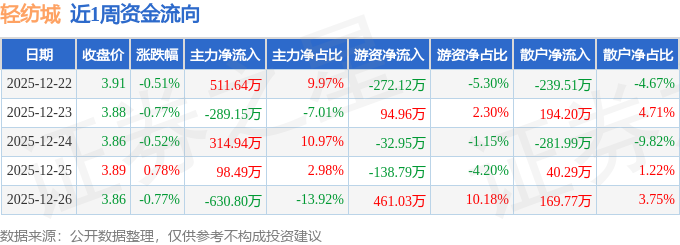 资金流向数据方面,本周轻纺城主力资金合计净流入5.12万元,游资资金合计净流入112.13万元,散户资金合计净流出117.24万元。本周资金流向一览见下表: