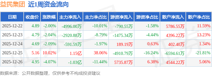 资金流向数据方面,本周益民集团主力资金合计净流出7283.15万元,游资资金合计净流出1251.63万元,散户资金合计净流入8534.78万元。本周资金流向一览见下表: