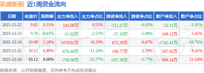 资金流向数据方面,本周凯盛新能主力资金合计净流出245.27万元,游资资金合计净流入405.41万元,散户资金合计净流出160.14万元。本周资金流向一览见下表: