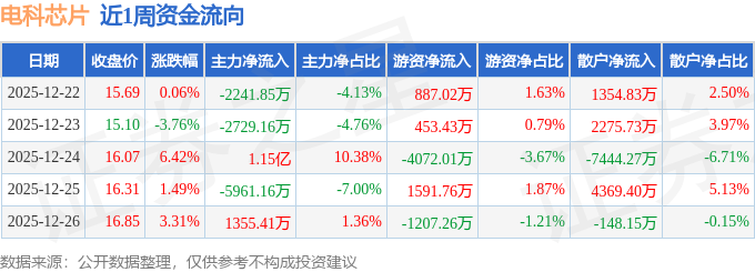 资金流向数据方面,本周电科芯片主力资金合计净流入1939.53万元,游资资金合计净流出2347.06万元,散户资金合计净流入407.53万元。本周资金流向一览见下表: