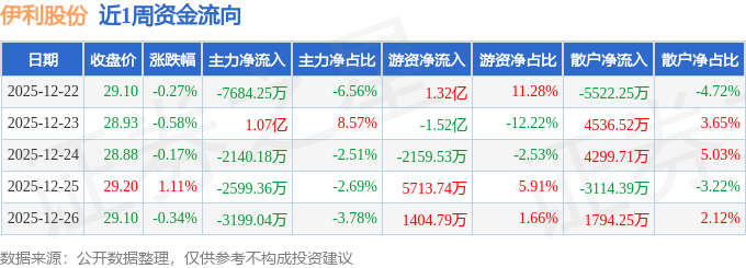 资金流向数据方面,本周伊利股份主力资金合计净流出4969.79万元,游资资金合计净流入2975.94万元,散户资金合计净流入1993.85万元。本周资金流向一览见下表: