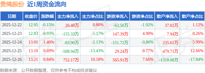 资金流向数据方面,本周贵绳股份主力资金合计净流入30.47万元,游资资金合计净流入527.33万元,散户资金合计净流出557.79万元。本周资金流向一览见下表: