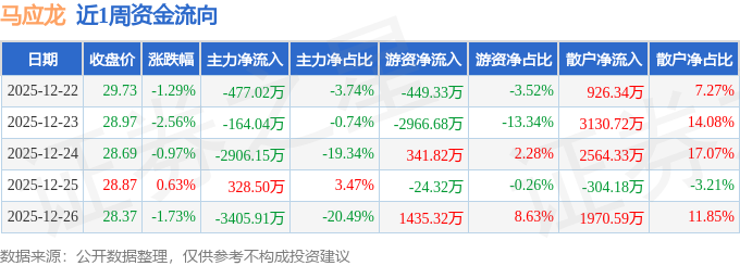 资金流向数据方面,本周马应龙主力资金合计净流出6624.61万元,游资资金合计净流出1663.19万元,散户资金合计净流入8287.8万元。本周资金流向一览见下表:
