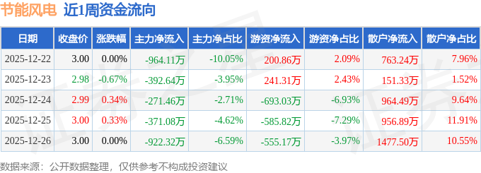 资金流向数据方面,本周节能风电主力资金合计净流出2921.6万元,游资资金合计净流出1391.85万元,散户资金合计净流入4313.45万元。本周资金流向一览见下表: