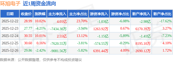 资金流向数据方面,本周环旭电子主力资金合计净流入4.15亿元,游资资金合计净流出1.47亿元,散户资金合计净流出2.68亿元。本周资金流向一览见下表: