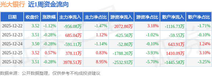 资金流向数据方面,本周光大银行主力资金合计净流入3494.48万元,游资资金合计净流出2926.63万元,散户资金合计净流出567.86万元。本周资金流向一览见下表: