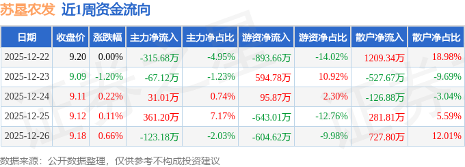 资金流向数据方面,本周苏垦农发主力资金合计净流出113.77万元,游资资金合计净流出1450.64万元,散户资金合计净流入1564.41万元。本周资金流向一览见下表: