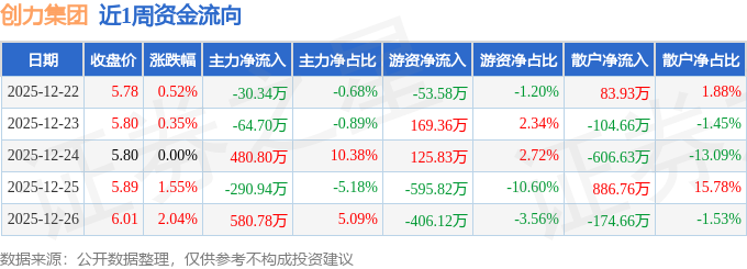 资金流向数据方面,本周创力集团主力资金合计净流入675.59万元,游资资金合计净流出760.33万元,散户资金合计净流入84.74万元。本周资金流向一览见下表: