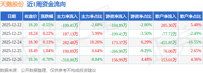 资金流向数据方面,本周天鹅股份主力资金合计净流入250.1万元,游资资金合计净流出150.84万元,散户资金合计净流出99.26万元。本周资金流向一览见下表: