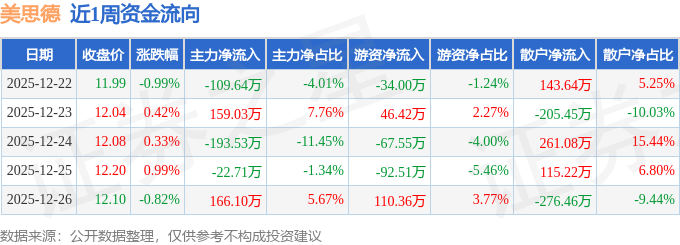 资金流向数据方面,本周美思德主力资金合计净流出0.75万元,游资资金合计净流出37.27万元,散户资金合计净流入38.02万元。本周资金流向一览见下表: