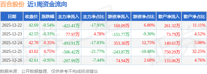 资金流向数据方面,本周百合股份主力资金合计净流出1551.76万元,游资资金合计净流入192.68万元,散户资金合计净流入1359.08万元。本周资金流向一览见下表: