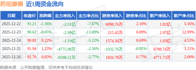 资金流向数据方面,本周药明康德主力资金合计净流出7.83亿元,游资资金合计净流入8582.53万元,散户资金合计净流入6.97亿元。本周资金流向一览见下表: