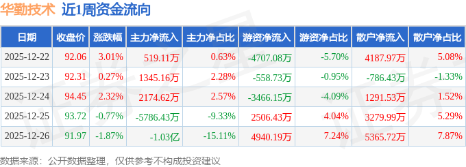 资金流向数据方面,本周华勤技术主力资金合计净流出1.21亿元,游资资金合计净流出1285.35万元,散户资金合计净流入1.33亿元。本周资金流向一览见下表: