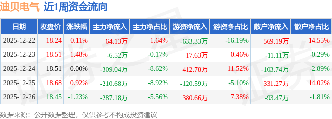 资金流向数据方面,本周迪贝电气主力资金合计净流出749.29万元,游资资金合计净流入57.15万元,散户资金合计净流入692.14万元。本周资金流向一览见下表: