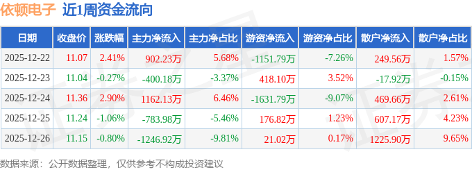 证券之星消息,截至2025年12月26日收盘,依顿电子(603328)报收于11.15元,较上周的10.81元上涨3.15%。本周,依顿电子12月25日盘中最高价报11.38元。12月22日盘中最低价报10.88元。依顿电子当前最新总市值111.33亿元,在元件板块市值排名25/57,在两市A股市值排名1749/5178。