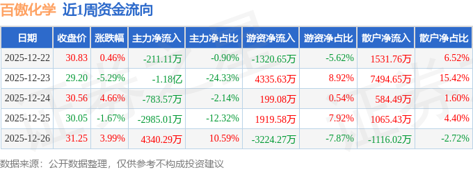 资金流向数据方面,本周百傲化学主力资金合计净流出1.15亿元,游资资金合计净流入1909.37万元,散户资金合计净流入9560.31万元。本周资金流向一览见下表: