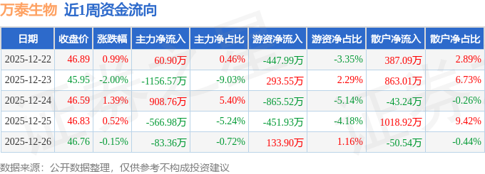 资金流向数据方面,本周万泰生物主力资金合计净流出837.24万元,游资资金合计净流出1337.99万元,散户资金合计净流入2175.23万元。本周资金流向一览见下表:
