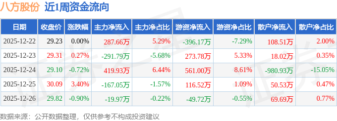 资金流向数据方面,本周八方股份主力资金合计净流入228.78万元,游资资金合计净流入505.4万元,散户资金合计净流出734.18万元。本周资金流向一览见下表: