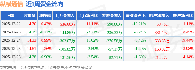 资金流向数据方面,本周纵横通信主力资金合计净流出207.73万元,游资资金合计净流出1242.85万元,散户资金合计净流入1450.59万元。本周资金流向一览见下表: