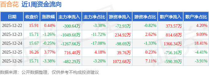 资金流向数据方面,本周百合花主力资金合计净流出2383.78万元,游资资金合计净流入1175.74万元,散户资金合计净流入1208.04万元。本周资金流向一览见下表: