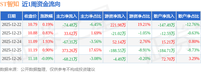 资金流向数据方面,本周ST智知主力资金合计净流入196.83万元,游资资金合计净流入60.05万元,散户资金合计净流出256.88万元。本周资金流向一览见下表: