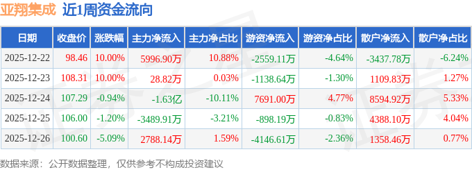 资金流向数据方面,本周亚翔集成主力资金合计净流出1.1亿元,游资资金合计净流出1051.56万元,散户资金合计净流入1.2亿元。本周资金流向一览见下表: